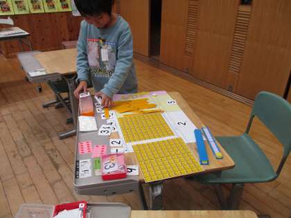 数カードとブロックを使って百の位を学習しました。「あいている位は0をいれるよ」「010で10かな」「百の位に0はいるのかな」学習をすすめると新たな疑問も出てきます。