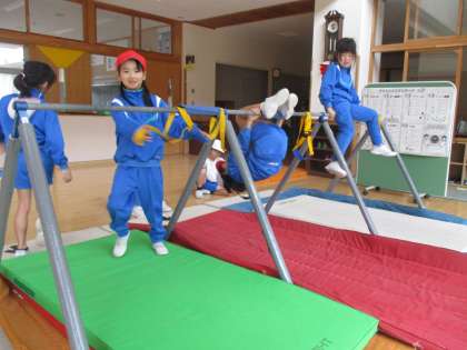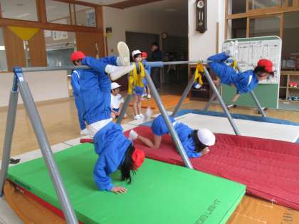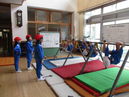 こうもり降りおりを特訓中の子供たち。きらきらタイムや昼休みの時間を使って練習しています。毎日取り組んでいる子供たちは両足で着地ができるようになってきています。