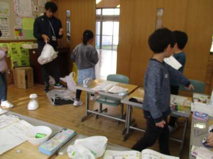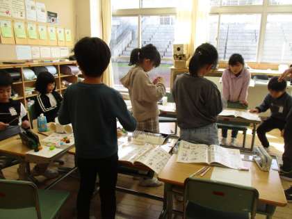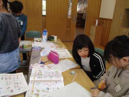 設計図をかく作業を手際よく終え、すぐにおもちゃ作りにとりかかりました。「どうやって穴をあけようかな」「どうやってタイヤが回るのかな」友達にききながら作業を進めていきます。