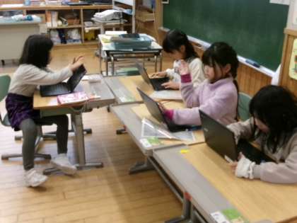 あゆみ渡しの間、やることが終わってしまった2年生の子供たち。「何をしたらいいかな」と声をかけると、机をくっつけて端末を準備し、ローマ字入力練習やデジタルドリル等を始めました。自分たちで考えて行動している姿が素敵でした。