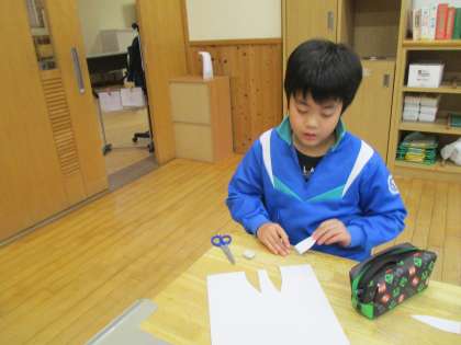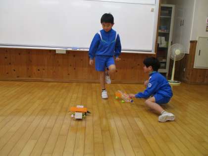 子供たちは2学期から引き続き動くおもちゃを作っています。「羽をつけたらもっと動くかな」「どうやればもっと上手くいくかな」試行錯誤を繰り返しています。