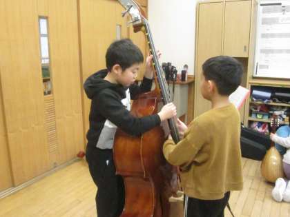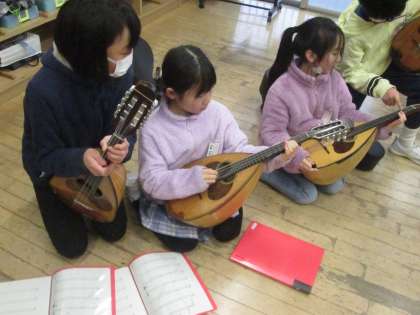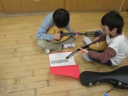 初めてマンドリンを練習しました。4,5年生に教えてもらいてドレミファソラシドを練習しました。指が痛くなったけど音が出るとうれしかったです。