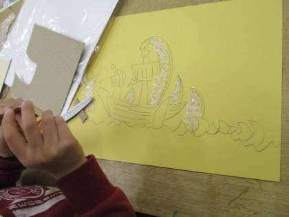 版に下絵を描いて紙を貼ります。紙もザラザラな紙、模様が入った紙、ブツブツな紙など様々です。どんな版画になるか楽しみです。