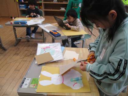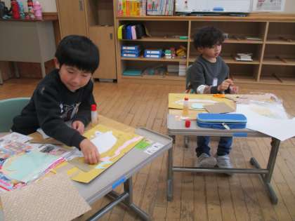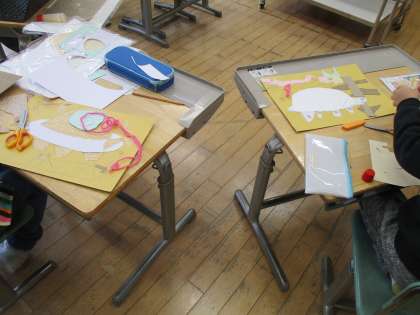 色んな模様の入った紙を切って版を作っています。どの色のインクを使って版を刷るか考えている子もいました。
