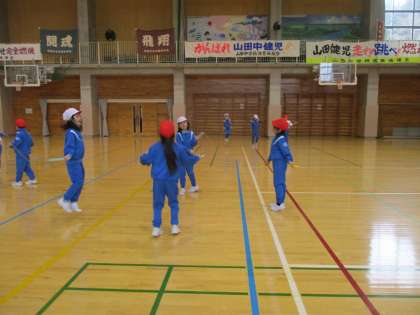 前跳びと異なる持ち方で子供たちは挑戦しました。「この方が跳びやすい」「慣れないけど、やってみよう」子供たちは自分の跳び方を追究します。