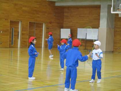 前跳びと異なる持ち方で子供たちは挑戦しました。「この方が跳びやすい」「慣れないけど、やってみよう」子供たちは自分の跳び方を追究します。