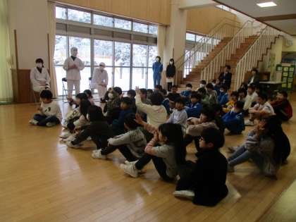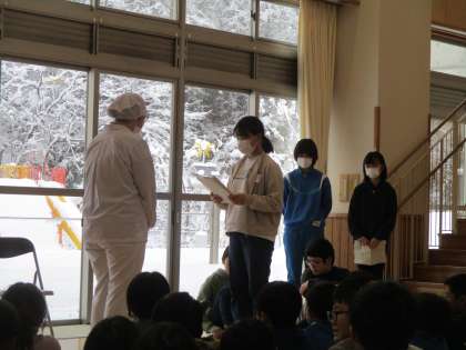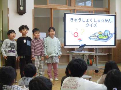 1年生はインタビューをもとにクイズを考えました。また、代表者は感謝の手紙を朗読しました。いつも衛生面に気を配りながら給食を作ってくださる調理員さん、学校栄養職員の先生、ありがとうございます。