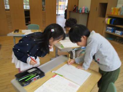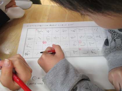 子供たちは友達の素敵な字にサインをしました。「○○ちゃんには素敵な字がたくさんあるね」「直したらいい字には△にしようかな」△を素直に受け入れ、直している子供たち。本当に素敵です。