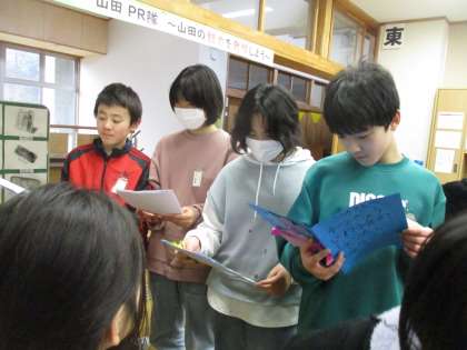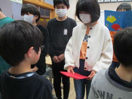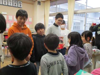 2年生が6年生に「卒業を祝う会の招待状」を渡している様子です。6年生は照れながらもとても喜んでいました。
