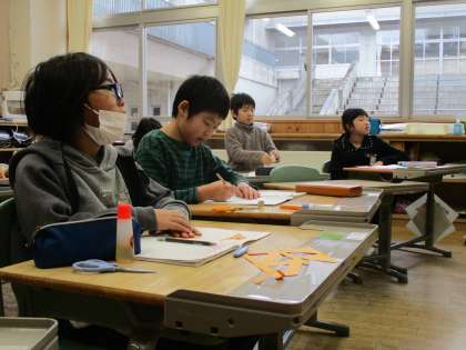 子供たちは手を動かしながら定規を使ってどんな三角形ができるかを考えました。正三角形や二等辺三角形の性質をふまえながら取り組みます。