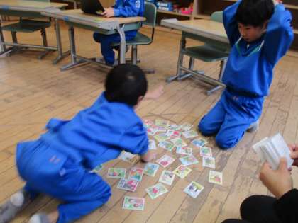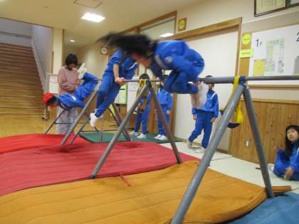 1年教室ではカルタをしている子供たちがいました。鉄棒の人気は相変わらず健在です。最近ではマットで走り幅跳びをしている子供たちの姿も見られます。