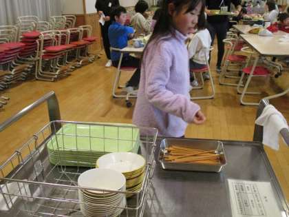 給食後、子供たちは歯を磨きます。子供たちは洗面所をきれいに使っています。そのきれいさは食器を片付ける際も同じです。きれいだと気持ちが良いです。