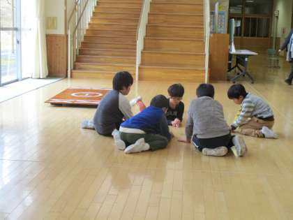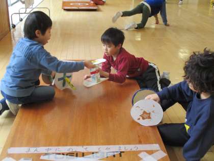 体育館でボールで遊んでいる子。図画工作科の作品で遊んでいる子。キャップを回して遊んでいる子など様々です。子供たちの大切な時間です。