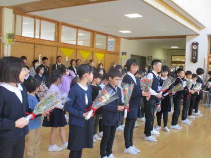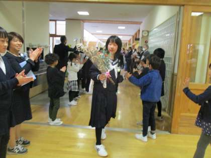 見送りの会で在校生から花束を渡しました。在校生は花道を作って卒業生を送ります。