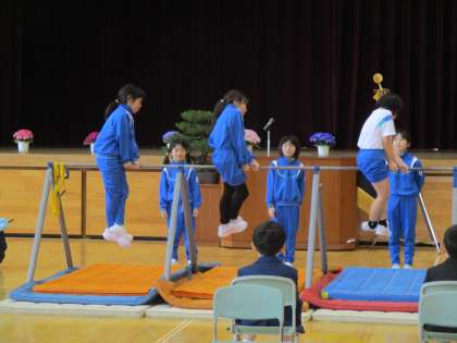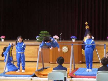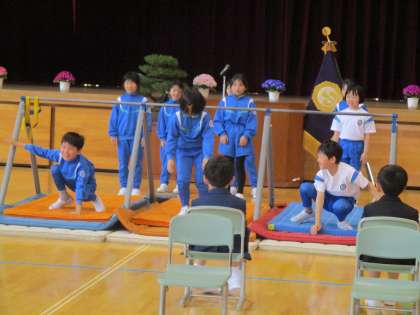 鉄棒の演技で、体を動かすことの楽しさを伝える子供たちです。