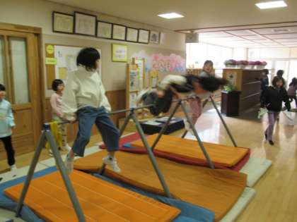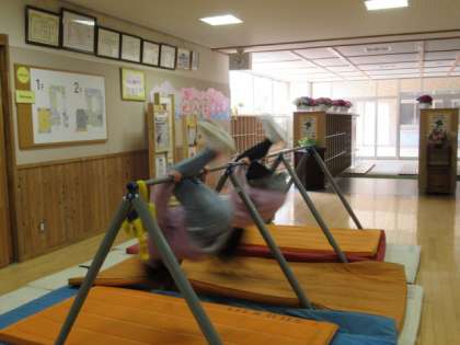暖かな日差しの下、外で体を動かす子供や室内の鉄棒で技を磨く子供の姿が見られました。