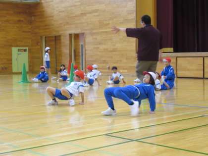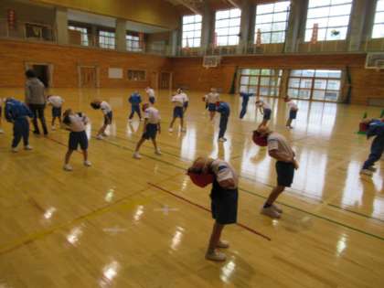 1〜3年生の体育の合同学習です。今日はいろいろな体の動かし方を試しました。準備運動からしっかり行いました。