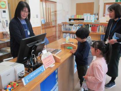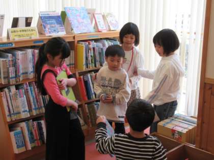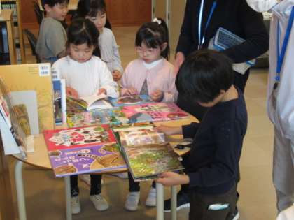 今日は、市立図書館に本を借りに行きました。たくさんの本の中から、どれを借りようかと迷う子供たちです。