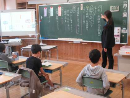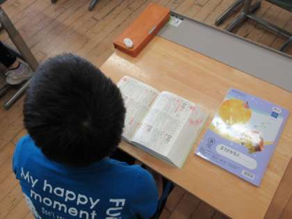 4年生の子供たちは、漢字辞典を使って文字を探していました。音訓索引、部首索引等、それぞれの便利さについて考えていました。