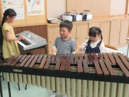 楽器を触って、音色を楽しんでいます。なんだか演奏会が始まりそうです。