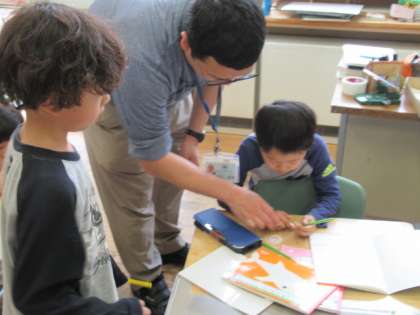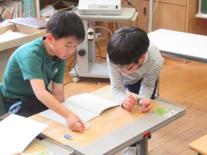2,3年生の子供たちが、互いの自主学習ノートを見合っていました。友達の取り組みに学び、そのよさを書いて伝えています。学んだことを、自分の学習にもつなげていこうね。