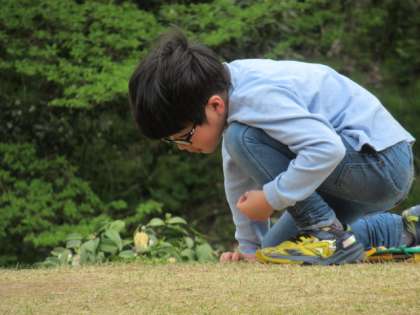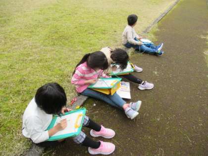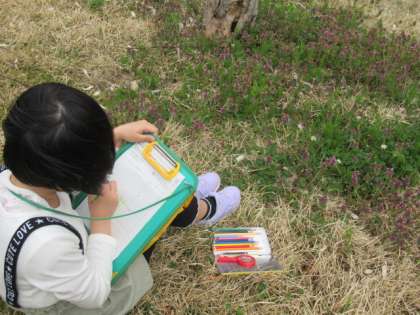 3年生の子供たちが、春の生き物を観察しています。タンポポやヒメノオドリコソウ等、よく見てシートにまとめていました。