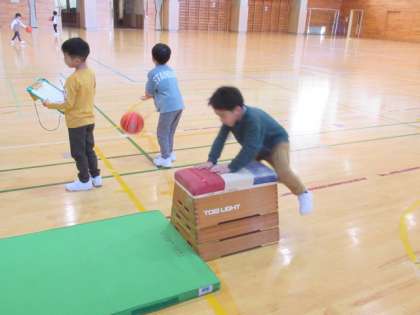 今日は、体育館を探検しました。いろいろな道具を見つけて体を動かす子供たちです。
