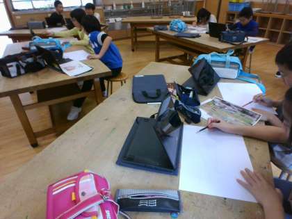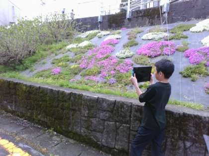 学校の周りの春を見つけて、端末で写真を撮影し、絵を描きます。水仙や芝桜、山桃等見つけて、シャッターを押しました。いくつかの春を組み合わて作品を仕上げるために、構図をじっくり考えました。