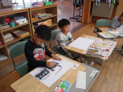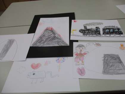 好きなものは何かな。教科書を参考にしたり、日常の生活・経験を思い出したりしながら、乗り物や食べ物、動物等、思い思いに描きました。
