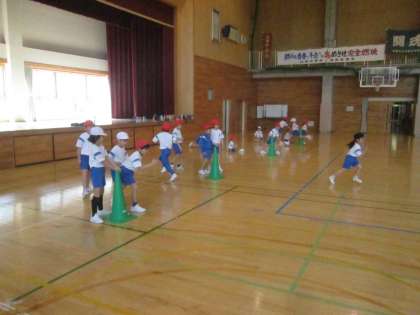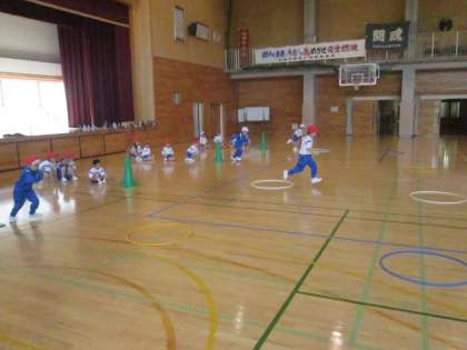 体をたくさん動かしました。ミニハードルやフラフープをつかって、かけっこをしました。ジャンプをしたり、ケンケンをしたりしながら、みんなで走りました。