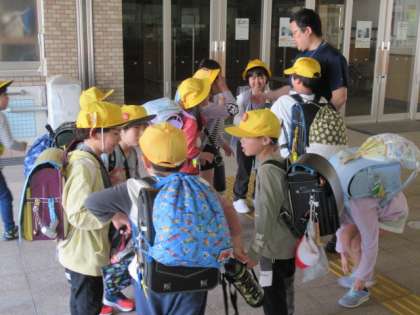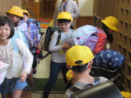 1〜3年生の子供たちが帰ります。1年生は、校歌を歌いながら歩いていました。今日も気を付けて帰りましょう。