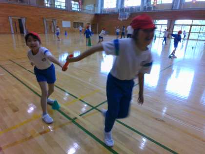 リレーに向けて、バトンパス練習をしました。教頭先生にコツを教えてもらい、受け取り方や渡し方を確かめました。