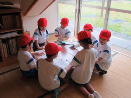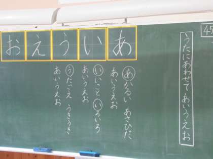 「あかるいあさひだあいうえお」の音読に挑戦しています。みんなで読むと、次はひとりひとり別々に分かれて取り組んでいました。
