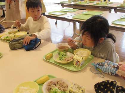 今日の給食です。みんな今日もしっかり食べています。