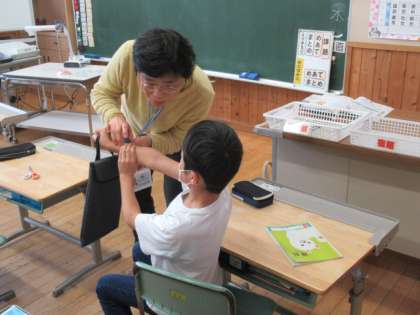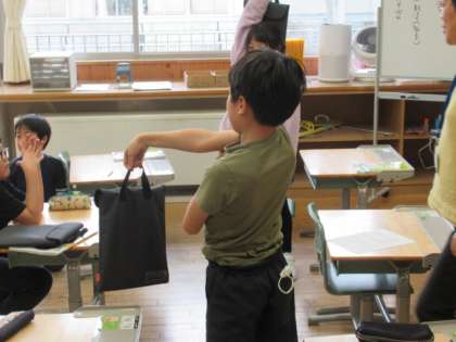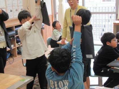 物を持ち上げるときに、腕はどのようになっているのかな。実際に物を持ち上げてみて、腕のどの部分がどのようになっているのかを確かめています。