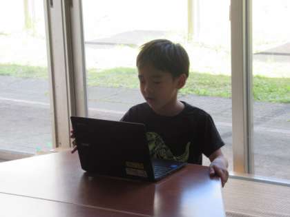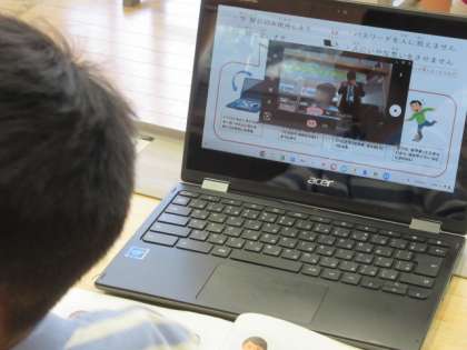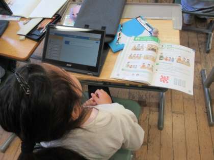子供たちは授業のいろいろな場面で端末を使っています。1年生は、自分の音読を録画して確かめていました。3年生は授業で学習したことを確かめるドリルに取り組んでいました。