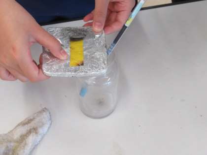 ものが燃えた後の空気は、どんな状態になっているのかを実験で調べました。