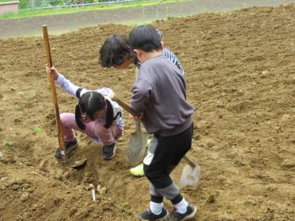 2年生は、生活科の学習で野菜づくりに取り組みます。2年生は、みんなで協力して自分たちの畝をつくりました。時折顔を出す虫たちが、2年生の子供たちの手を止めてしまうこともありましたが、なんとか畝も完成しました。これから、どんな野菜を育てるのでしょうか。