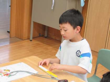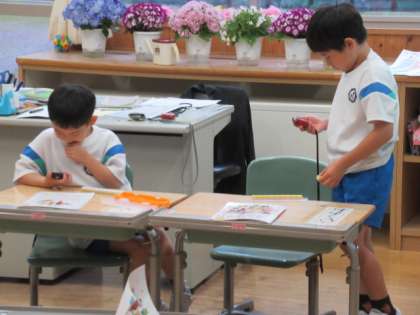 「10は、いくつといくつ」に取り組みました。ブロックを使って確かめながら活動する子供。もう覚えてしまって、タイムを計測しながら言ってみる子供。それぞれの取組が見られます。
