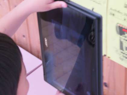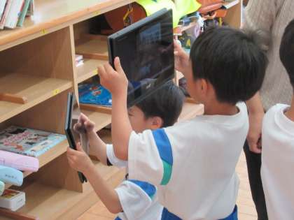 学校探検のときに、端末を使って写真を撮るようです。そのための練習が、教室で行われていました。