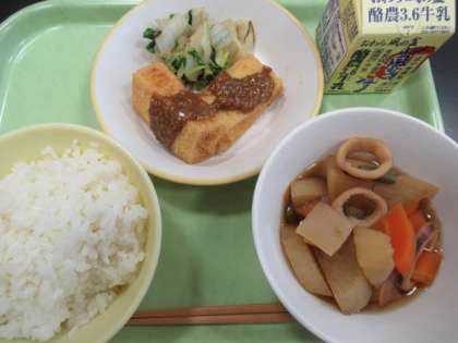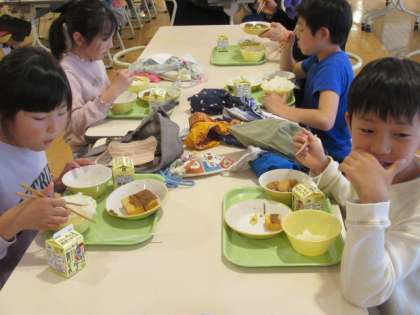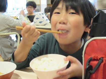 「揚げ出し豆腐がおいしい」「煮物がおいしい」子供たちのいろいろな声が聞こえる中、一番の人気は「ご飯」でした。お米のおいしさを満喫する子供たちです。