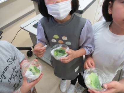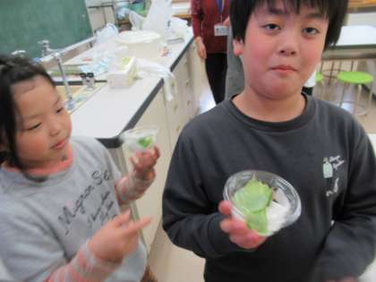 3年生の子供たちは、今日からアオムシを育てて観察します。中には自分の観察するアオムシに名前を付けて声をかけている子供もいました。