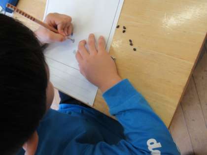 1年生の子供たちは、生活科の学習であさがおを育てます。今日は、種を植える前に、種の観察を行いました。形を見るだけでなく、においや手触りを確かめながら記録していました。