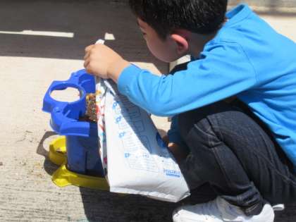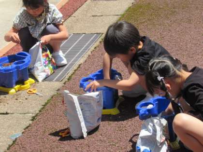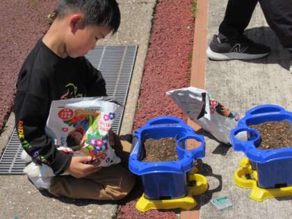 アサガオの種を植えています。植木鉢に土を入れたり、種を埋める深さを確かめたり、子供たちは慎重に作業していました。芽が出てくる日が楽しみですね。