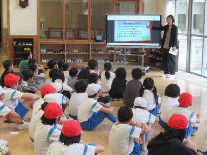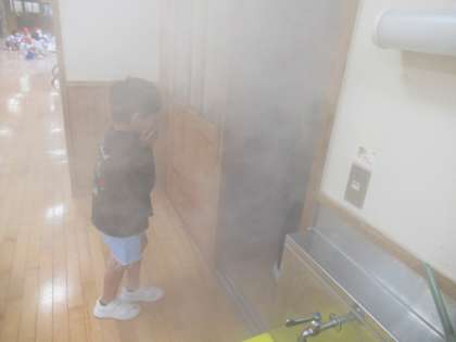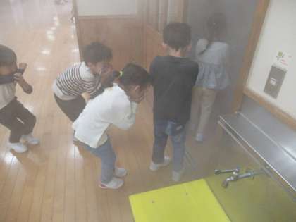 防火教室の際に、煙中体験を行いました。ハンカチで口を覆うことの大切さや、煙の中では姿勢を低くして歩くことの意味について、体験を通して学びました。