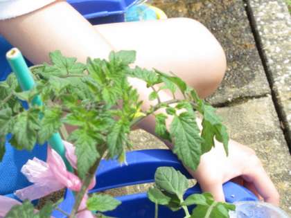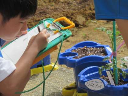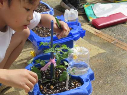 今日は、鉢植えの野菜を観察しました。葉の数や花の形等、細かく確かめようとする子供たちです。