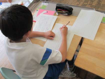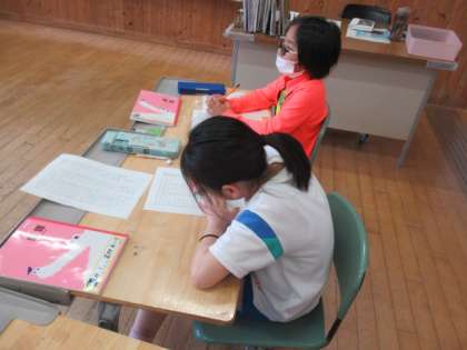 先日、インタビューで聞き取ったことを、今度は教室の仲間に伝えます。聞き取ったことを分かりやすく伝えようと、原稿を見直す子供たちです。