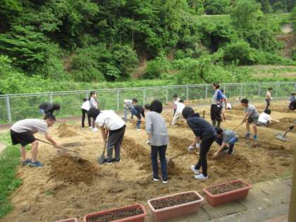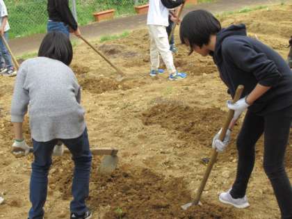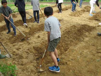 今年もスマイル班でサツマイモを育てます。そのために、高学年の子供たちが班の畝をつくりました。その横で畑仕事をしていた3年生も、高学年の子供たちの手伝いを始めました。