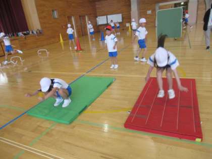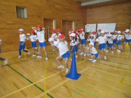 全校児童で、スクワット、ミニハードル、反復横跳び、上体起こし、ボール投げ、立ち幅跳びと、多くの運動に挑戦しました。
