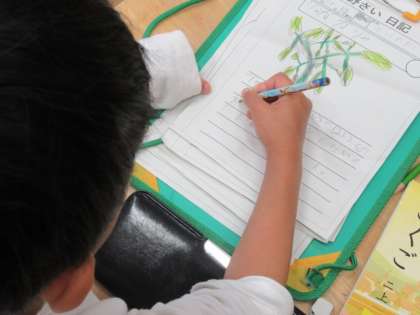 観察したことを友達に伝えます。観察メモを友達に読んでもらって、育てている野菜の様子を分かってもらおうと、字を丁寧に書いています。